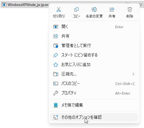 WindowsXPMode_ja-jp.exeを右クリックして、「その他のオプションを確認」を選択する。