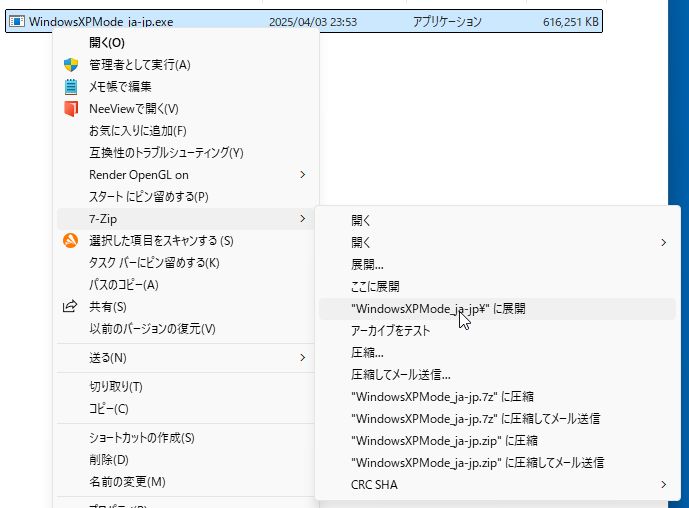 7-Zipにカーソルを合わせて、コンテキストメニューから「WindowsXPMode_ja-jp.exe」に展開を選択する。