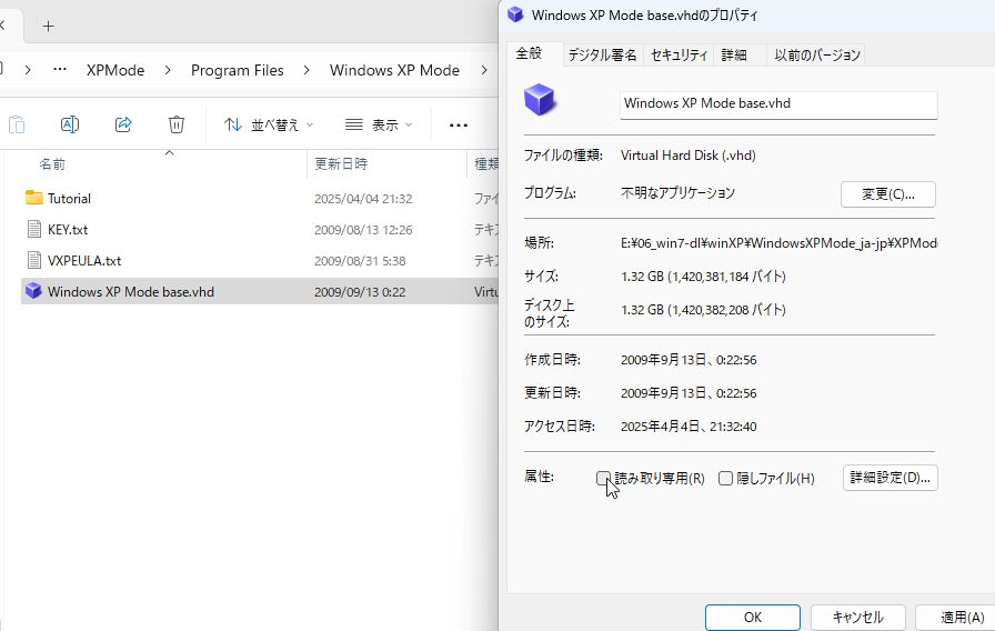 \XPMode\Program Files\Windows XP Modeフォルダ内にある、「Windows XP Mode base.vhd」ファイルのプロパティを表示し、読み取り専用のチェックを外す。